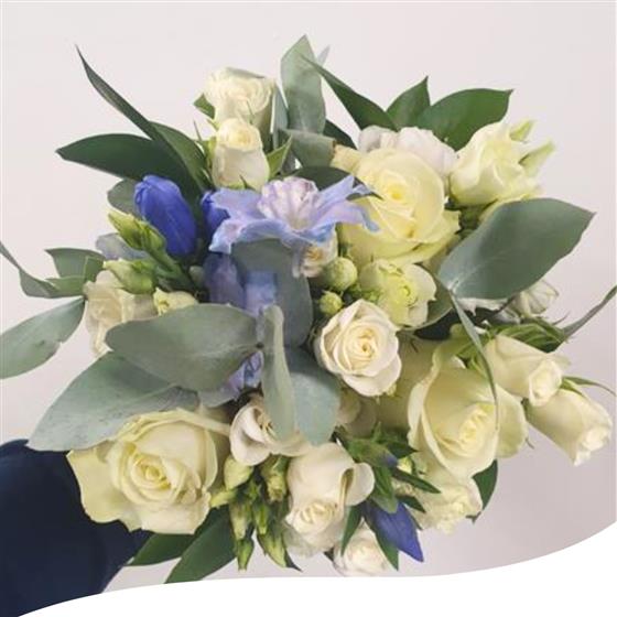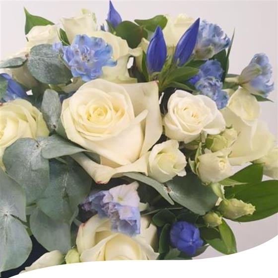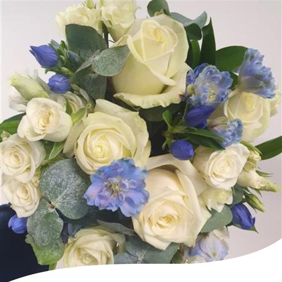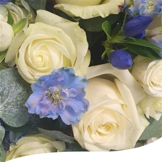 We will use pale blue Delphinium, White Avalanche Roses, Blue Gentian, White Spray Roses with some Cinerea Eucalyptus.