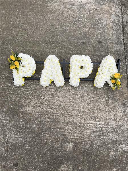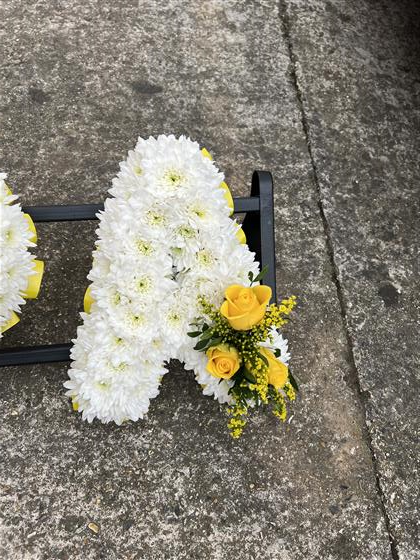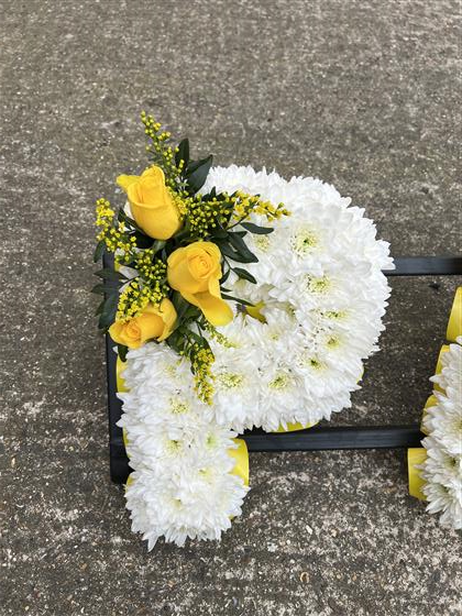 A Papa Tribute made using ribbon edge, Chrysanthemum and rose sprays.