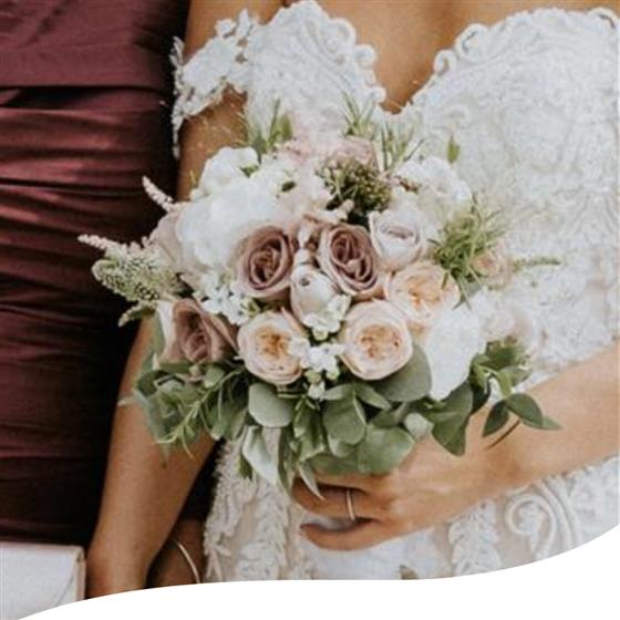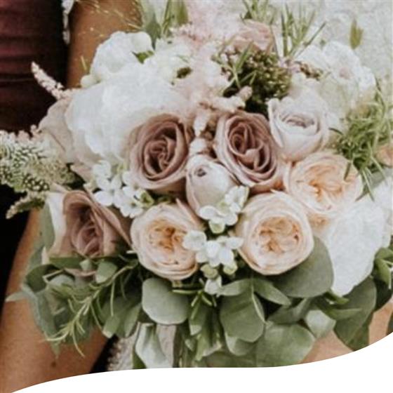 The design we would recommend, after our consultation, emails and conversations has to be a Circular Hand tied Bouquet design with a compact neat style and with a different array of flowers creating a bouquet with different shaped flowers and foliage at slightly different levels. We will not make it symmetrical. Mixed foliage, especially Eucalyptus and a touch of Rosemary with loosely arranged flowers using these elegant blooms: 7 x Amnesia Roses, 3 xHydrangeas but arranged into smaller bits all over the bouquet, 5x Astilbe, 5 x White Veronica, 5x White Bouvardia, 6 x White Avalanche, 7 x VIP Pale “Paradise Beach” Roses, 5 x White Hypericum, 3 x Pearl Avalanche. The colours are peach, Pale Pinks, Lilac and cream with Cinerea, Berried Euco, Parvi, Populus and Rosemary as the only greens. We will not make it overly Huge and not bigger than the picture.