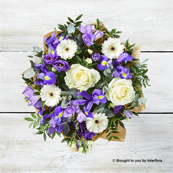 Featuring ivory large headed roses, purple freesia, white germini, purple lisianthus and blue veronica with pistache, presented in a gift box.