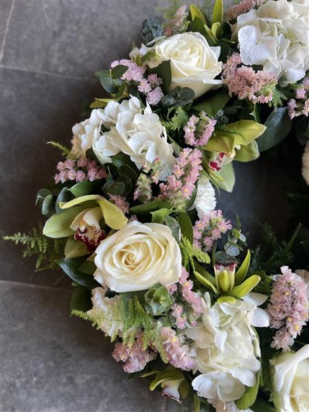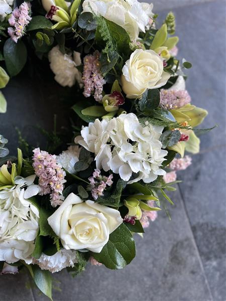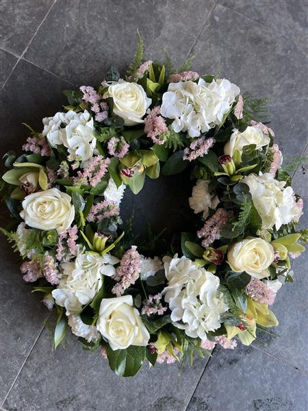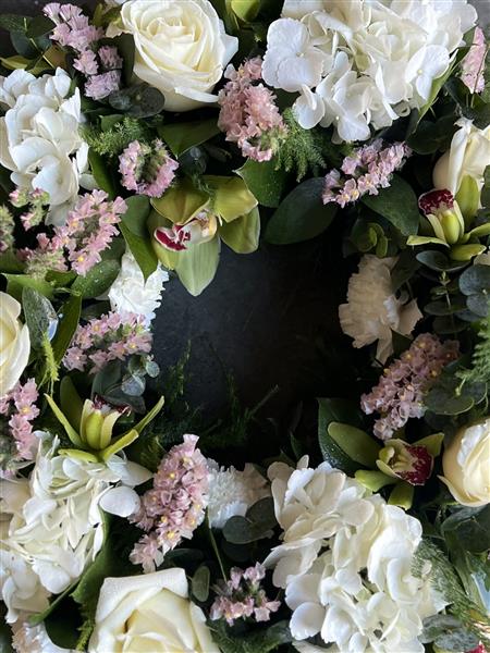 A beautiful pastel shaded Hydrangea and Orchid Wreath. With white roses and pale pink statice this wreath is eye catching. A lovely tribute to a loved one and suitable for any type of memorial.