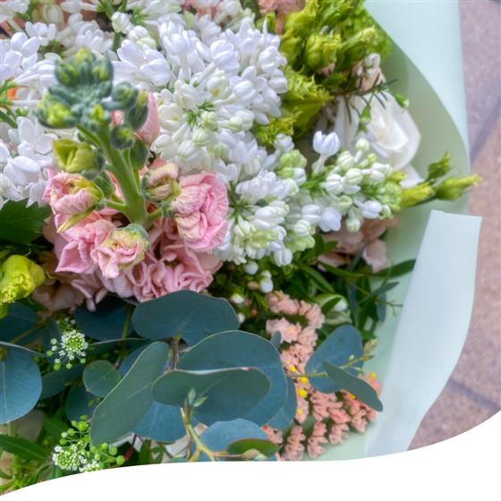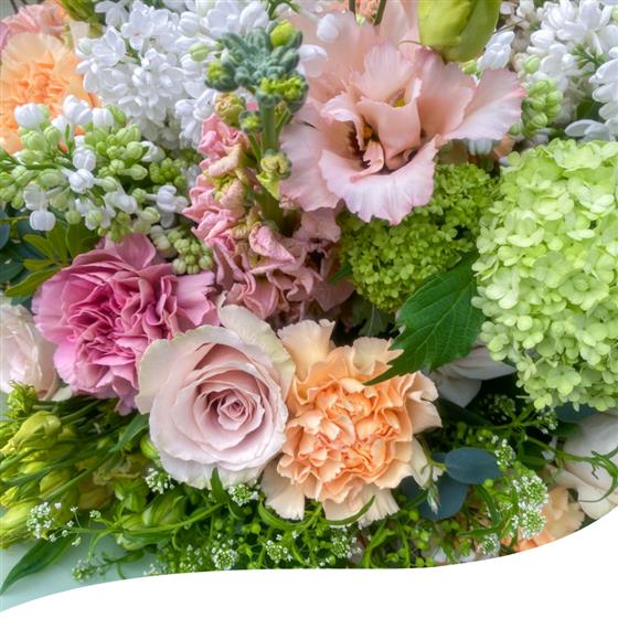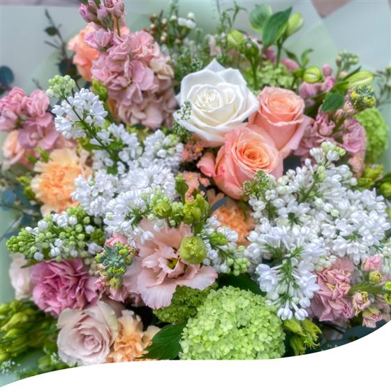 Each petal is a masterpiece, delicately imbued with pastel tones that evoke a sense of calm and tranquility. Featuring Peach Roses, White Roses, Lisianthus, Viburnum, Stocks, Carnations, Syringa, Statice and Eucalyptus leaves, this bouquet was meticulously crafted to infuse your space with timeless elegance.