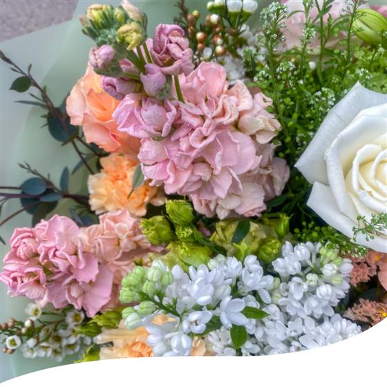 Introducing our enchanting Pastel Petal Promenade, where every delicate bloom whispers tales of serenity and grace. Crafted with meticulous care and inspired by the soft hues of nature's palette, this hand-tied bouquet transports you to a realm of tranquil beauty.