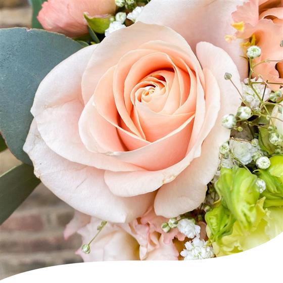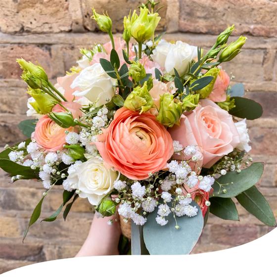 Experience the captivating charm of our Pastel Romance Bridesmaid Bouquet, designed to complement our Pastel Romance Bridal Bouquet. This stunning arrangement features a soft pastel colour scheme, with elegant Ranunculus, Avalanche Roses, white Roses and other beautiful blooms.