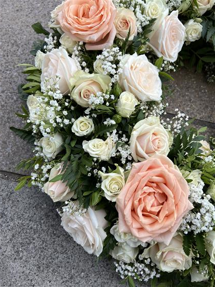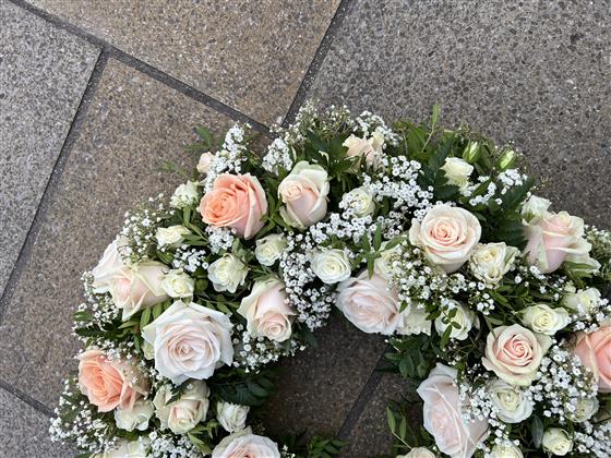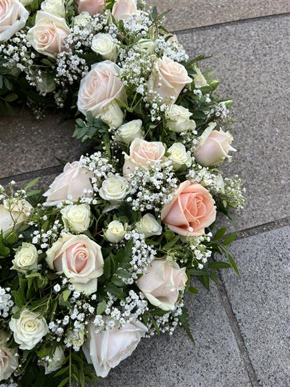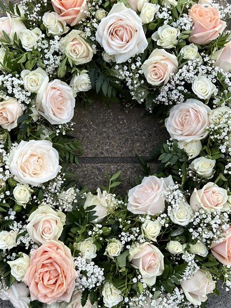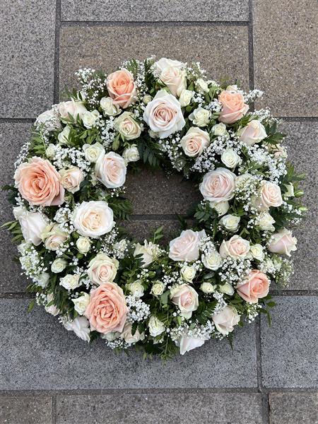 A beautiful pastel Rose Wreath made with Dorchester Roses, Pearl Avalanche Roses, White Snowflake spray Roses, Talia cream Roses finished with gyp and foliage.