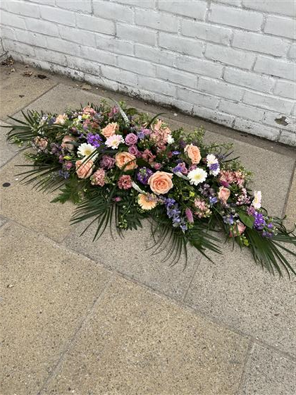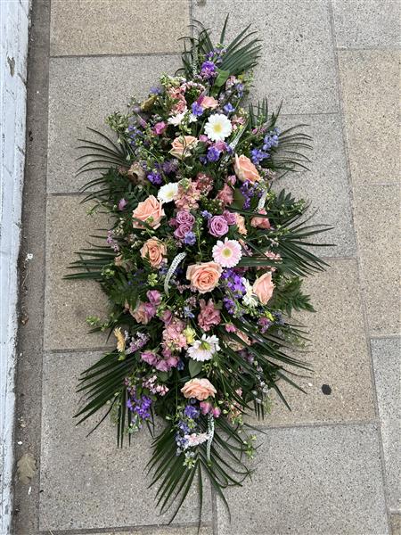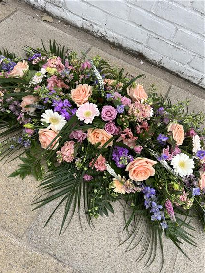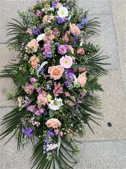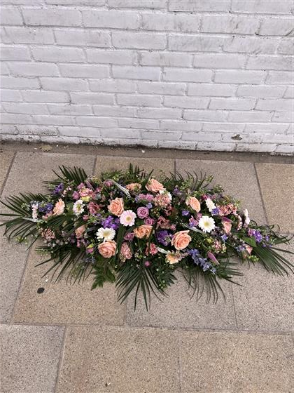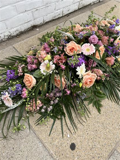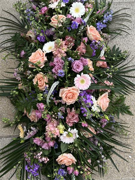We made this coffin spray using a beautiful blend of Pearl Avalanche Roses, Lilac Larkspur and Delphiniums, Pale Pink Bouvardia, Lilacy Pink Spray Roses, Peach, Pink and White mini Gerberas, Peach and Lilac Stocks, Mixed foliage and a blend of lilac, White and Pink Veronicas.