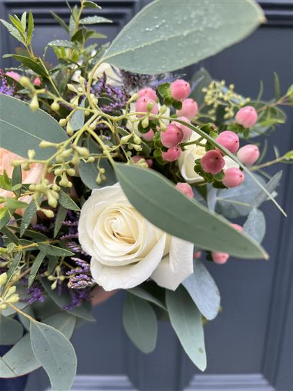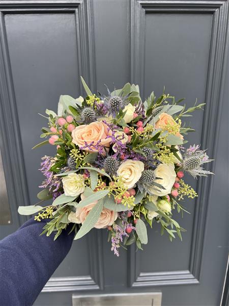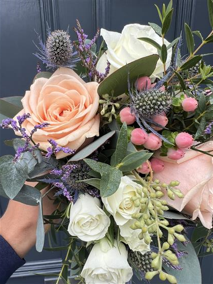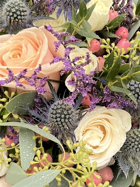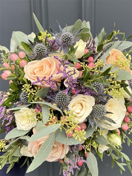 A beautiful bridal bouquet consisting of Pearl avalanche roses, Blue Eryngium Thistles, Cream Mondial Roses, Cream Spray Roses, Pink Hypericum Berry’s, Mixed Eucalyptus and purple Limonium Emille.