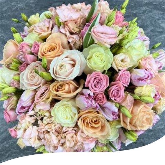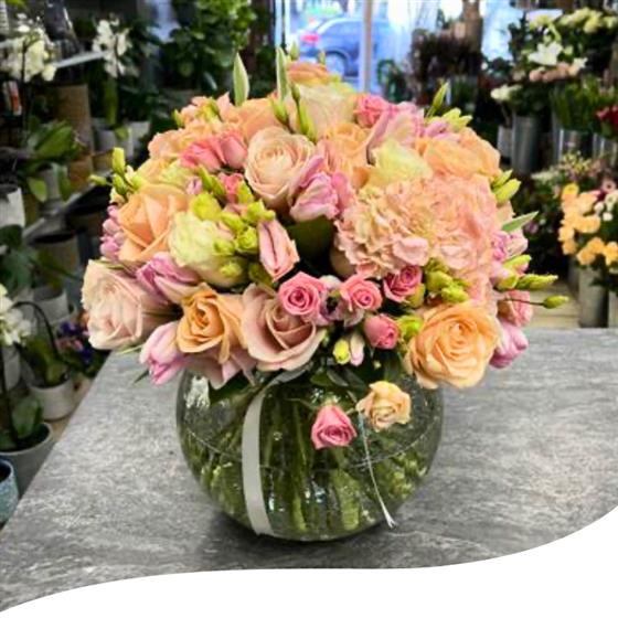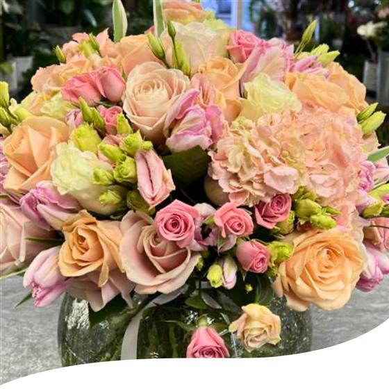 Our Peach & Pink Globe Vase Arrangement features a stunning mix of premium blooms. Delicate Pearl and Sweet Avalanche Roses blend beautifully with Pale Pink Spray Roses, while Pink Peonies, Dendrobium Orchids, and Cymbidium Orchids add layers of elegance. Dusky Pink Anthuriums and Champagne Lisianthus complete the look, creating a lovely blend of colours and textures.