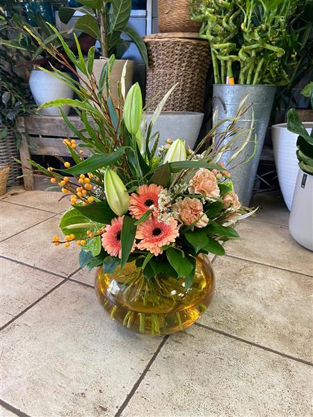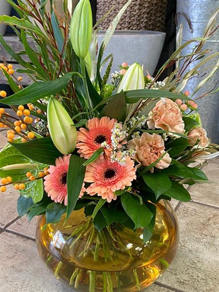 Globe glass vase arrangement in Whites, Limes, Peach and Orange.