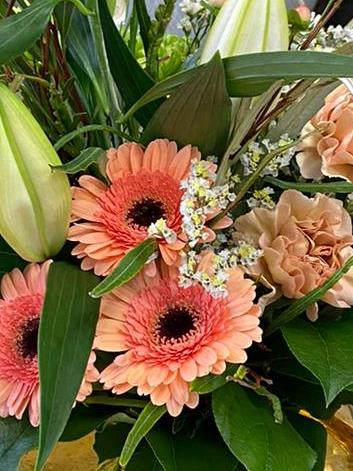 Made up with Green Anthiriums, Peach Gerberas, Honey Carnations, Orange Ilex berries and White Oriental Lily.