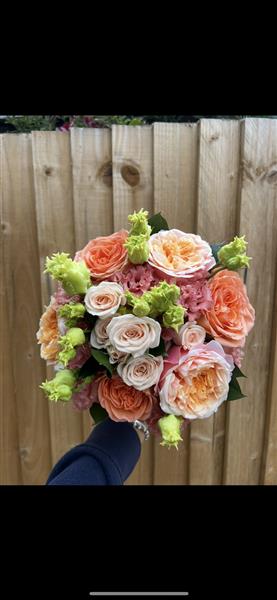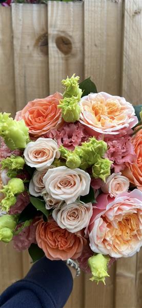 This is a vibrant stunning bridal bouquet featuring a mix of large peach and apricot roses with a stunning pastel peach spray rose and Lisianthus stems.