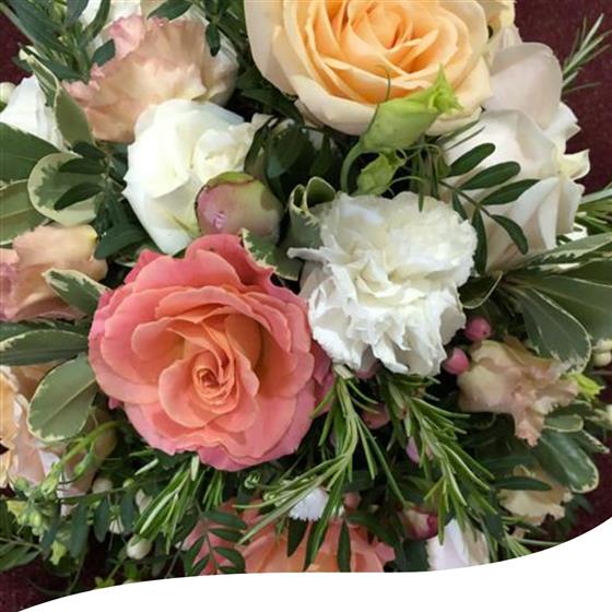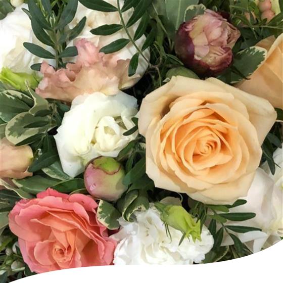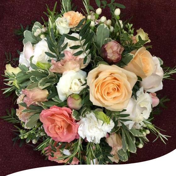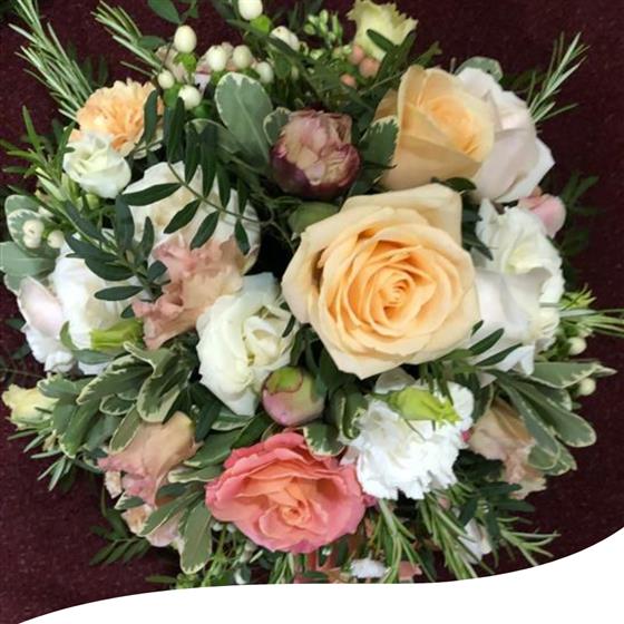 This stunning bouquet is a harmonious blend of peach, pink, cream, and white blooms, featuring Peach Avalanche Roses, Miss Piggy Roses, Champagne Lisianthus, Cream Hypericum Berries, White Frilly Lisianthus, and Pale Pink Peonies. Accented with aromatic Rosemary, Eucalyptus, and mixed foliage, this bouquet exudes a fresh, elegant charm. Finished with a luxurious ribbon stem wrap, it's the perfect choice for any occasion that calls for beauty and grace.