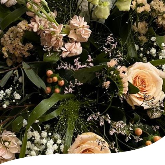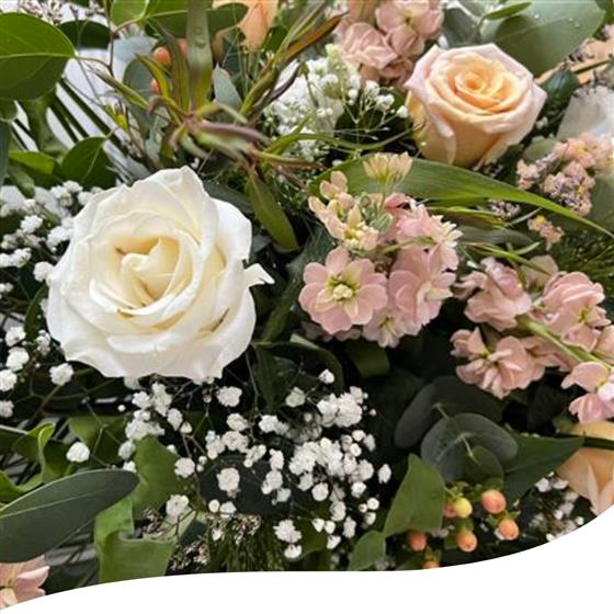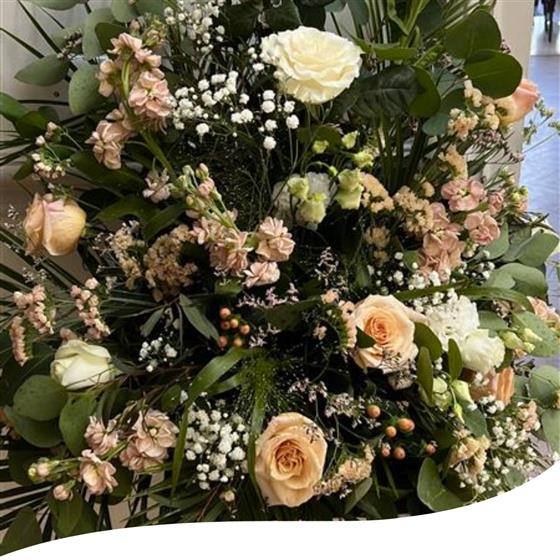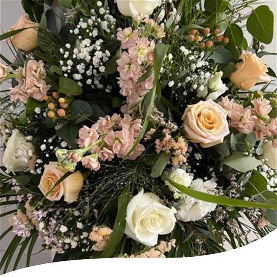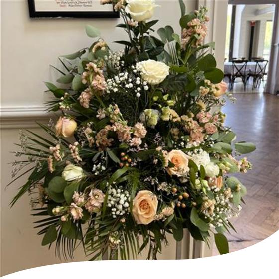 A beautiful front facing pedestal arrangement using wild flowers and grasses. Peach Stocks, Shinmer Roses, Peach Hypericum, Gypsophila, Peach Statice, White Lisianthus and a mixture of foliage including Eucalyptus.