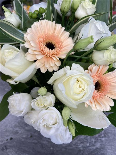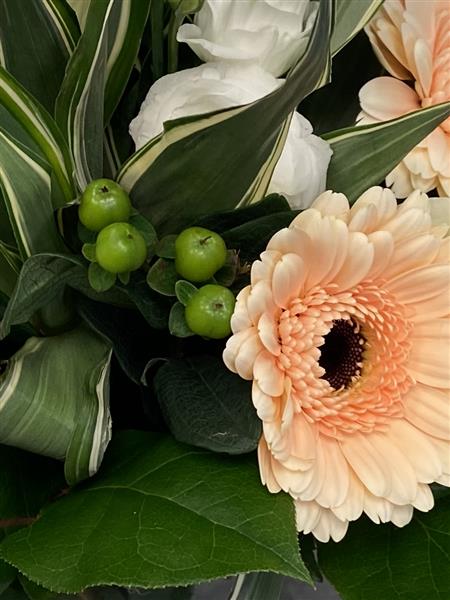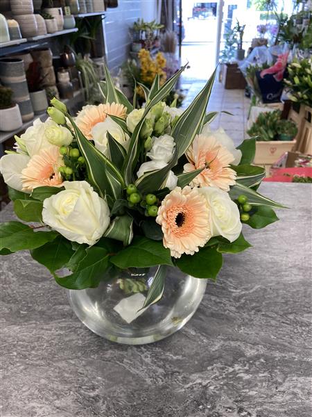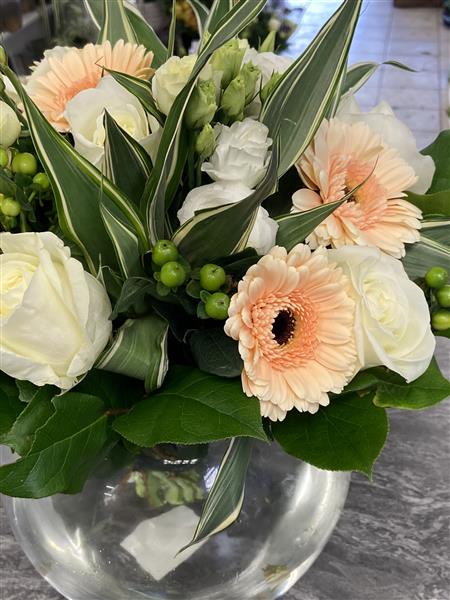 This Peaches and Cream Globe arrangement includes Gerberas, Hypericum, Lisianthus and Roses. Arrives as pictured in the vase.