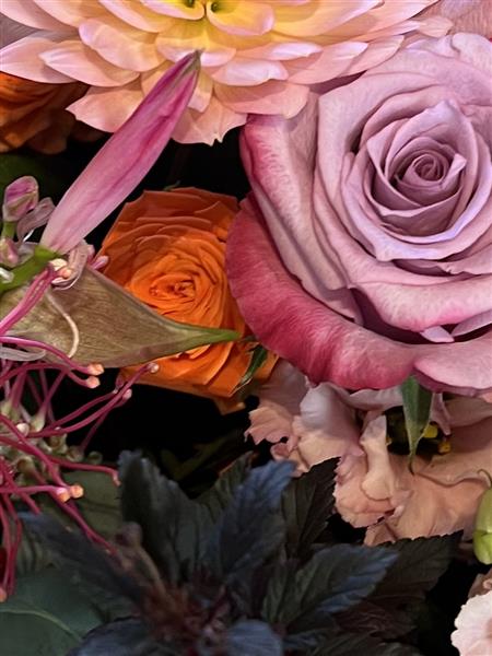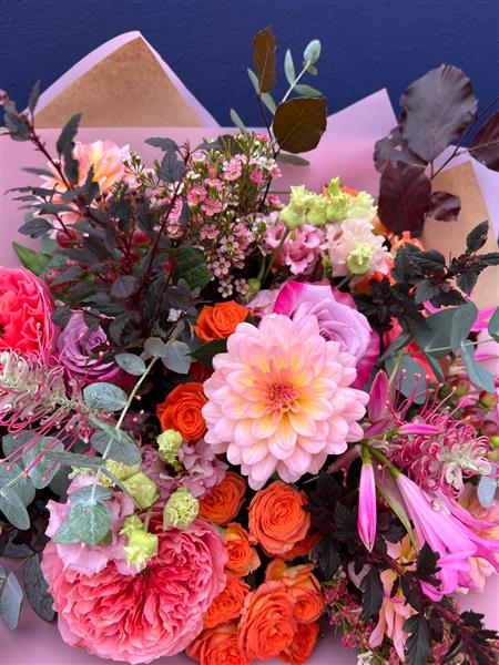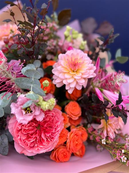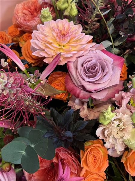 Red Grevillia Spider-Man, peach Dahlias, dark red Hypericum, peach and pale pink Lisianthus, Lilac Ecuadorean Roses, Pink Nerines, Orange Spray Roses, Mixed Eucalyptus, dark beech leaves, red Amaranthus, cerise Pink Garden Roses, Pink and White wax flower.