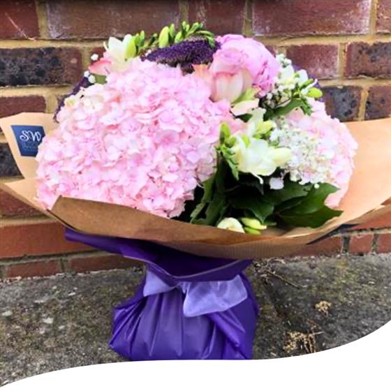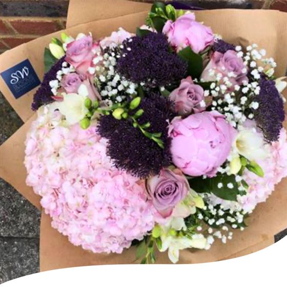 Perfect for any occasion, from weddings to anniversaries or simply to brighten someone's day, our Peony & Hydrangea Bouquet is sure to leave a lasting impression. Bring the beauty of the garden indoors with this exquisite arrangement, crafted with care and attention to detail.