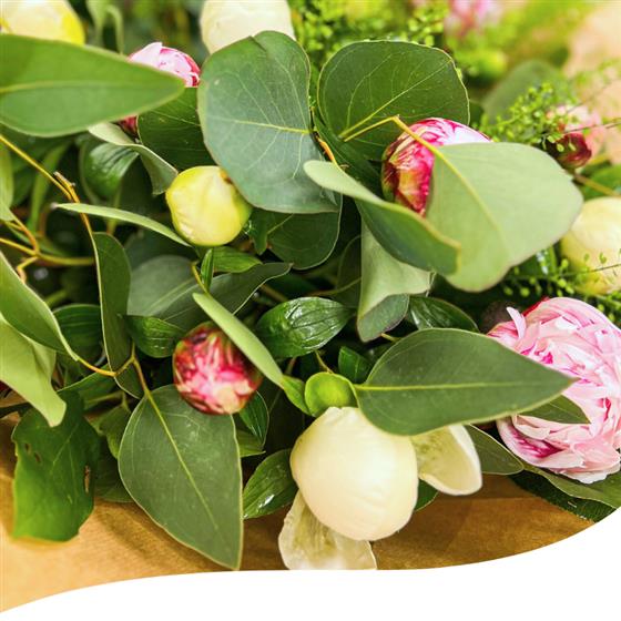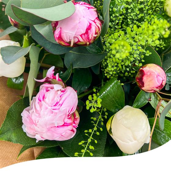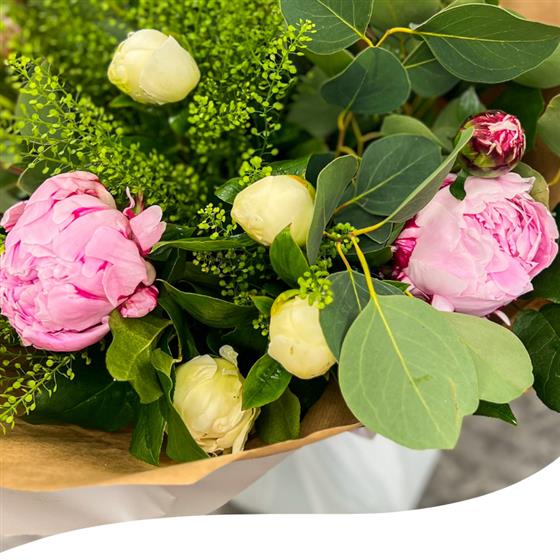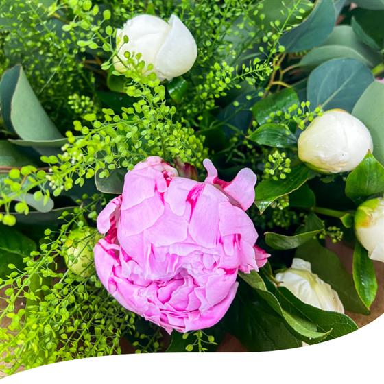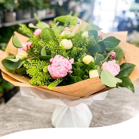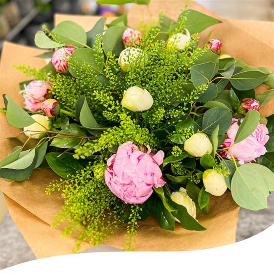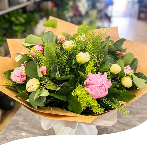 Experience the season's beauty with our Peony Charm Bouquet, a delightful mix of seasonal Peony blooms, including the elegant Sarah Bernard and the vibrant Captain Nemo varieties.