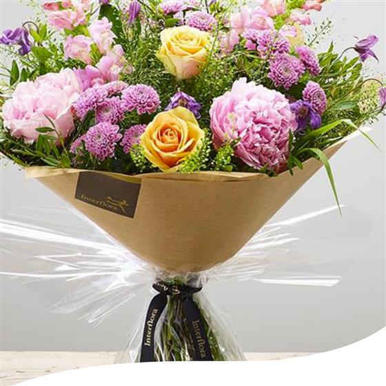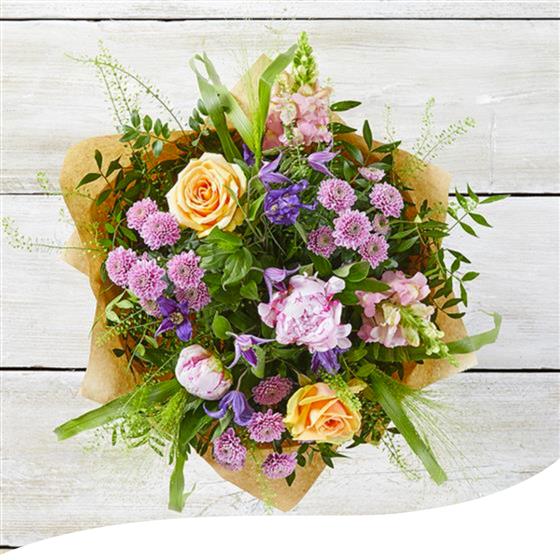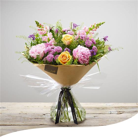 Experience the charm of our Peony Fairytale Bouquet, a hand-tied arrangement featuring a delightful mix of Peonies, Antirrhinums, Roses and Clematis. Each bloom is carefully selected and expertly arranged to create a bouquet that captures a touch of magic and romance.