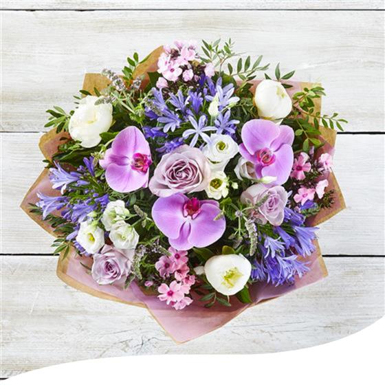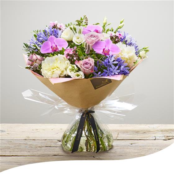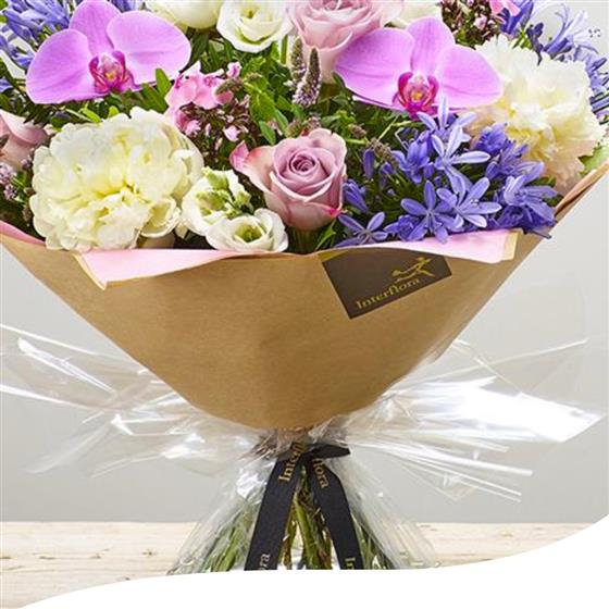 Introducing our Dahlia & Peony Bouquet, the perfect combination of elegance and charm. This exquisite arrangement features beautiful Agapanthus, Orchids and Peonies, complemented by Roses, Veronicas, and Phlox in delightful pink shades. A top seller during Peony season, this bouquet is sure to impress with its stunning variety and vibrant colours. When Peony Season ends we will have to substitute the Peony for other seasonal blooms.