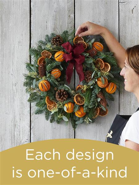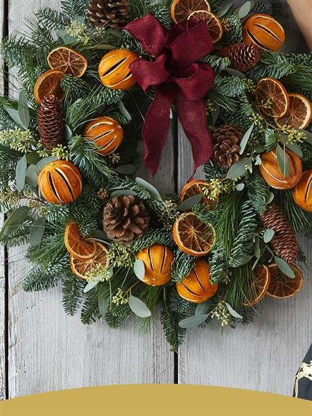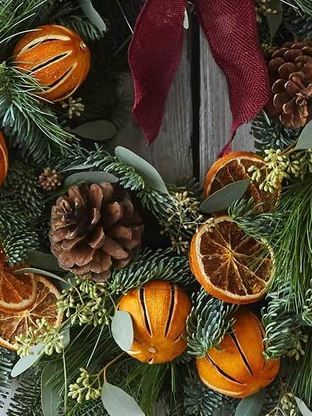 A lovely Wreath Decked with full and sliced Oranges, mixed Pine Cones and Berried Eucalyptus.