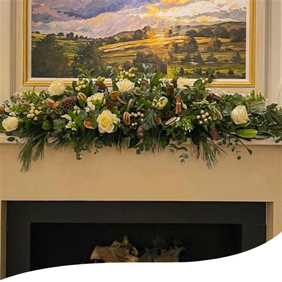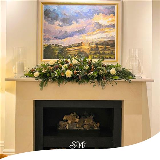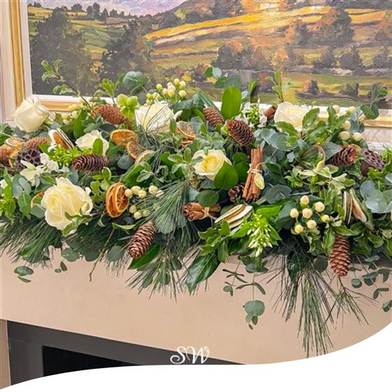 Introducing our Front-Facing Fireplace Christmas Arrangement — a charming centrepiece to elevate your festive décor. Adorned with Avalanche Roses, Pines, Dried Oranges, Cinnamon, Hypericum and lovely Greenery, this creation adds warmth and elegance to your holiday setting.