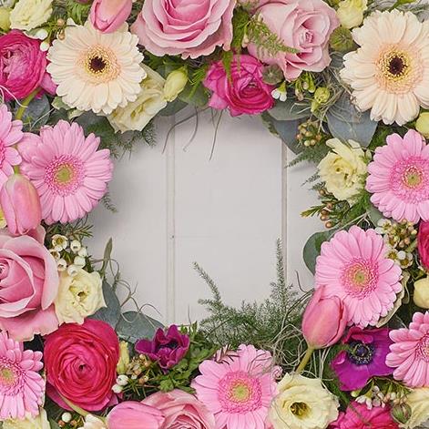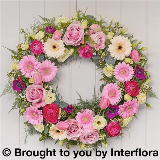Featuring pink large headed roses, cerise ranunculus, cream lisianthus, pink tulips, cerise anemones, pink germini, peach germini, white waxflower, trailing fern, eucalypthus and pittosporum arranged in a presentation ring.