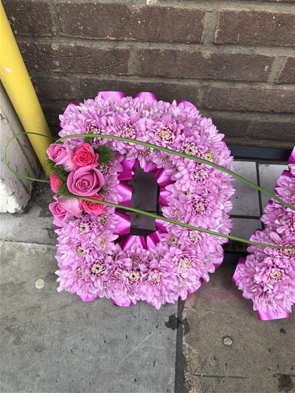 A DAD Funeral Tribute in Pink Chrysanthemum base and Pink Ribbons with Pink Rose Sprays.