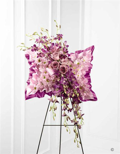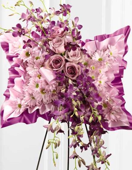 Light pink spray chrysanthemums, purple dendrobium orchids and lavender roses are beautifully arranged against a bed of purple and lavender satin to create a stunning presentation. Displayed on a wire easel, this arrangement bursts with grace and elegance.