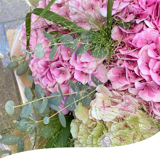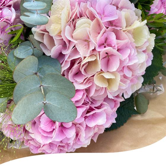 This bouquet features 5 stunning Pink Hydrangeas, each hand-selected for its colour tone and lush petals, complemented by fresh Eucalyptus and Salal to add texture and a refreshing aroma. This arrangement is presented in a water bubble to ensure the flowers remain fresh and hydrated during delivery.