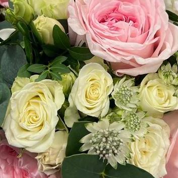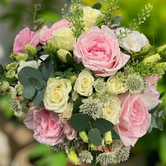 A bridal bouquet using the Pink Ohara Garden roses. These roses are perfumed and are a great choice for your wedding day. White spray roses and green Astranthia complete the florals in this bouquet.