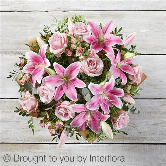 Featuring pink Oriental lilies, pink large headed roses and pink spray roses, hand-tied with eucalyptus and pistache, presented in luxury Gift Packaging.