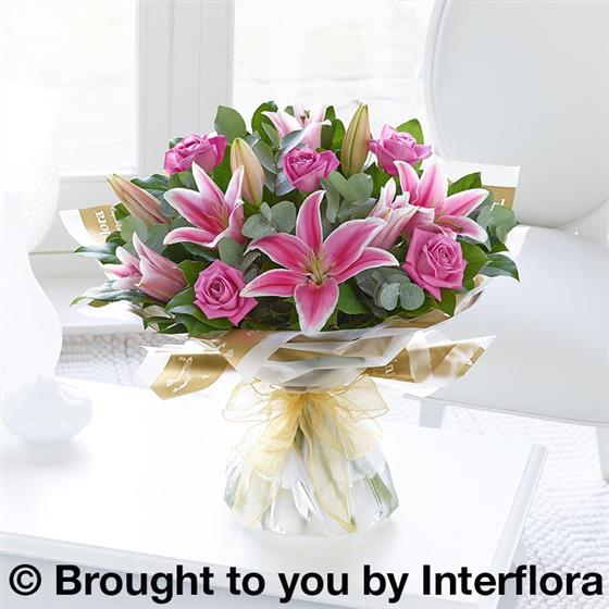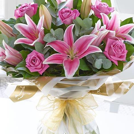 Featuring 5 pink large headed roses with 2 pink Oriental lilies, eucalyptus and salal leaves, handtied and presented in frosted gift packaging.