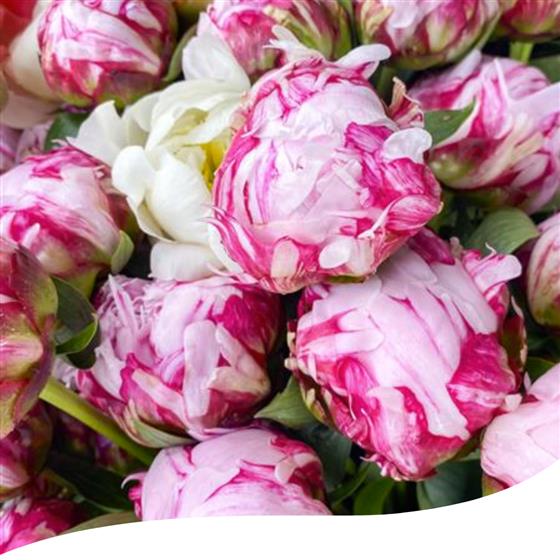 Introducing our stunning collection: 20 Pink Sarah Bernhardt Peonies accompanied by a delightful selection of foliage. Each bouquet is elegantly wrapped in brown paper and tied with a charming bow, ready to grace your vase with effortless elegance.