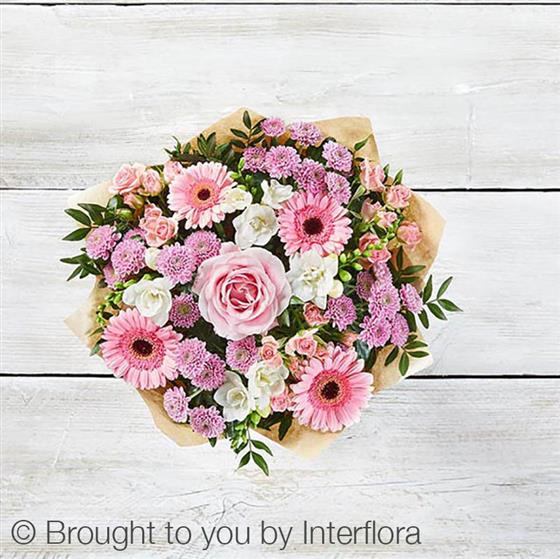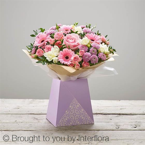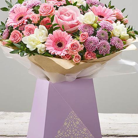 Featuring a pink large headed rose, white freesia, pink spray chrysanthemums, pink germin and pink spray roses with pistache, presented in a pretty lilac gift box.