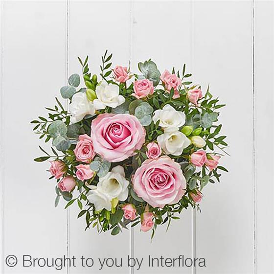 Featuring pink large headed roses, white freesia and pink spray roses with eucalyptus, dried lavender and pistache, presented in a soft nude hatbox.