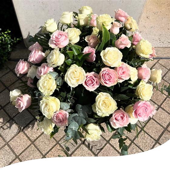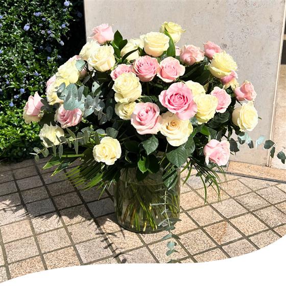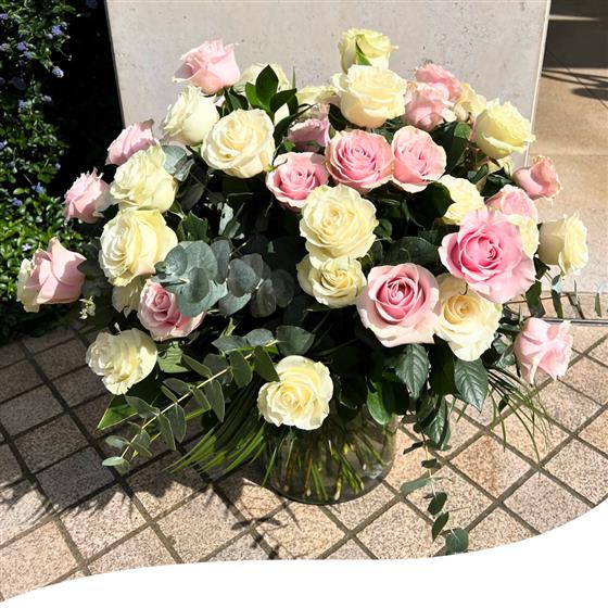 Delight in the timeless beauty of our Pink and White Rose Harmony Vase Arrangement. This stunning arrangement features 50 mixed Pink and White Roses, carefully curated to create a mesmerising display. Nestled within lush, green foliage, each Rose stands out, showcasing its natural elegance and charm. Perfect for any occasion, this arrangement brings a touch of sophistication and grace to your space. Order now and let the beauty of Pink and White Roses brighten your day.