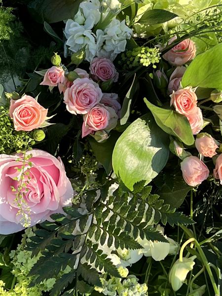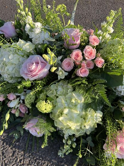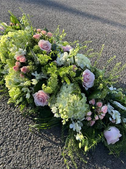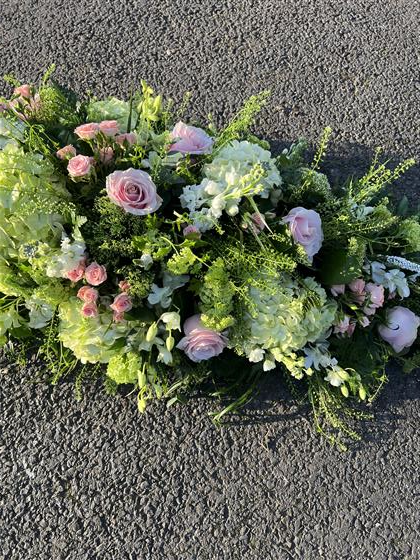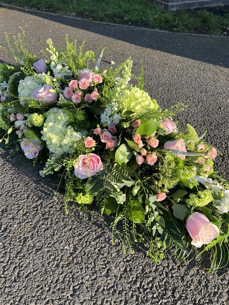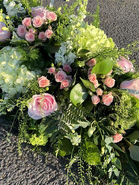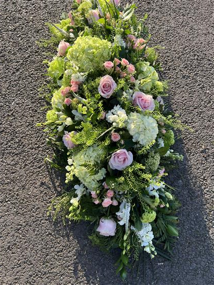 A soft blend of pale pink, green and white flowers created this beautiful coffin spray.