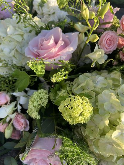 White Veronica’s, Green Hydrangeas, Viburnum, Pink Mondial Roses, Pink Spray Roses, White Dendrobiums Orchids, White Stocks, White Lisianthus. Using soft greens such as Thlaspi Green-bell, Panicum Fountain grass, Palms and Leatherleaf Ferns.