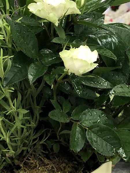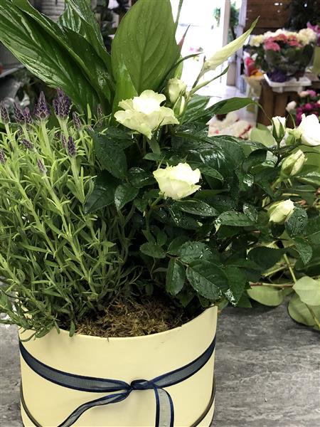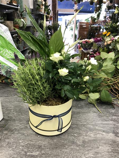 A beautiful Planted Hatbox with a. Mixture of seasonal plants. Picture contains lavender, Peace lily and a white Rose Plant.
