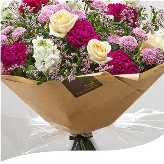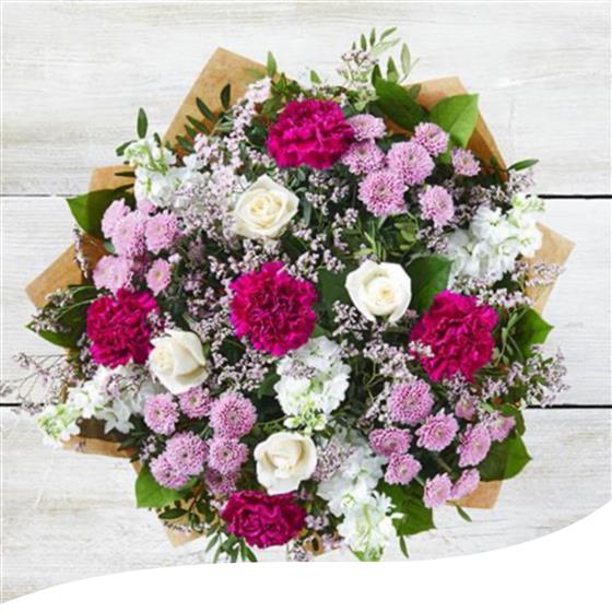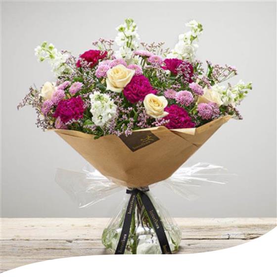 Introducing our Pomegranate Punch Hand-Tied (Large) —a graceful assembly of cream Large-Headed Roses, Cerise Carnations, White Stocks, Pink Spray Chrysanthemums and Pink Limonium. This exquisite arrangement is expertly hand-tied with accents of Pistache and Salal, creating a harmonious blend of colours and textures.