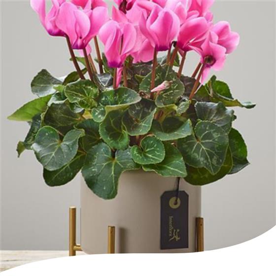 Elevate your space with our Popping Pink Cyclamen Plant. This charming plant, showcased in a sleek grey ceramic pot on a stylish gold stand, adds a touch of elegance to any setting. Bring the beauty of nature indoors with this delightful pink Cyclamen that's perfect for gifting or enhancing your own decor.
