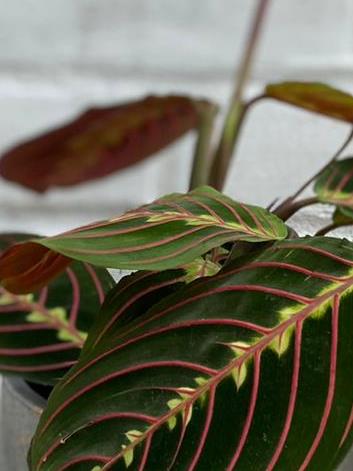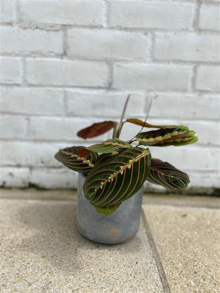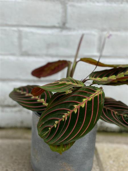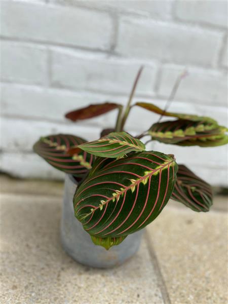 A Prayer Plant also known as a calathea. Indoors only and likes light. Water it when the soil is dry roughly once every 10 days.