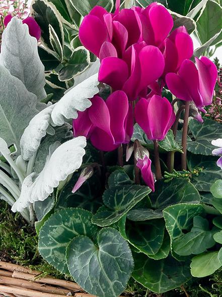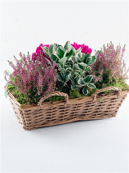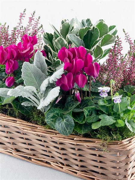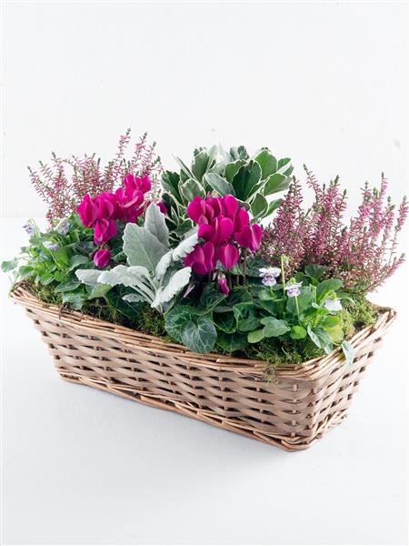 Featuring an euonymous silver, pink callunas, cerise cyclamens, lilac violas and cinerea planted in a window box or basket.