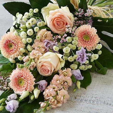 An abundance of blush pink blooms featuring fragrant peach stocks, pale pink roses and lilac lisianthus.