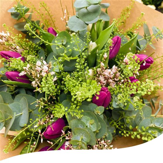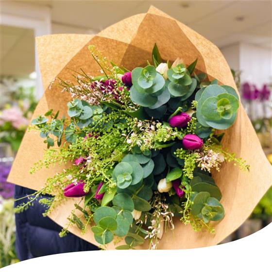 Purple & White Tulips With Eucalyptus Hand-Tied