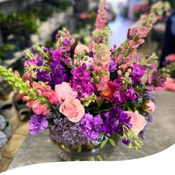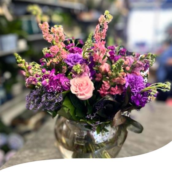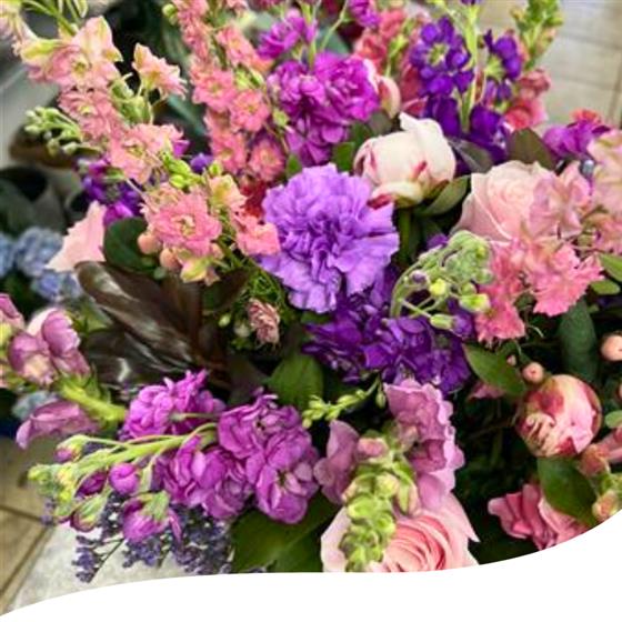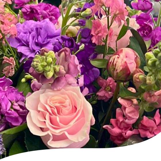 This arrangement features a beautiful mix of Hydrangeas, Peonies(when in season), Roses, Alliums, Stocks, Hypericum, and Carnations. Each bloom is carefully chosen to complement the others, creating a harmonious blend of colours and textures.