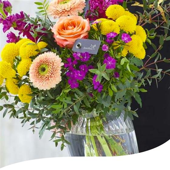 Add a touch of summer vibes and grace to your space with our Purple Bliss Vase Arrangement. This gorgeous arrangement features a vibrant mix of purple, orange and yellow blooms expertly arranged to capture the essence of the season. Delivered in a sleek transparent vase, it’s the perfect way to brighten someone’s day with a burst of colour and joy.
