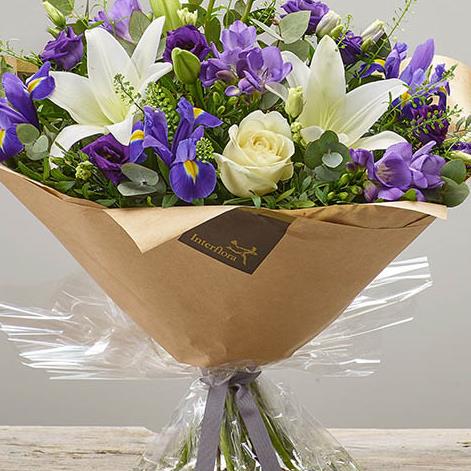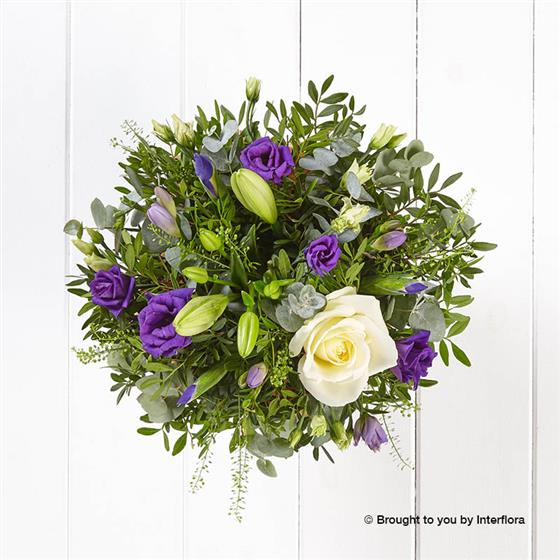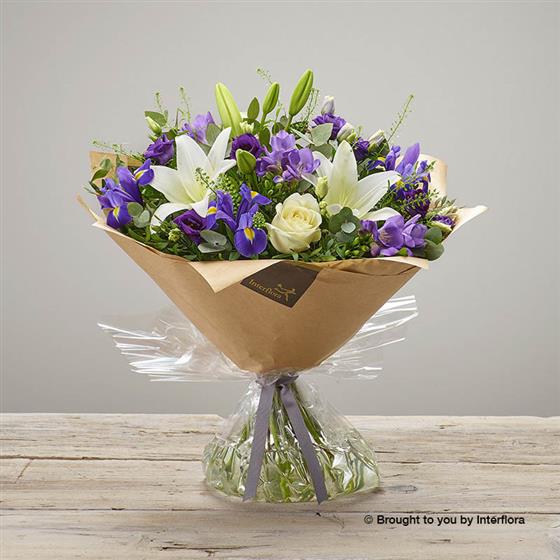 An elegant hand-tied to send a thoughtful gift during times of sorrow. Our beautiful Purple Comfort Hand-tied has been carefully designed by florists in soft white and pretty purple shades.