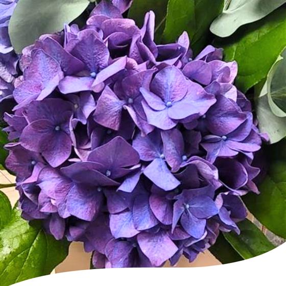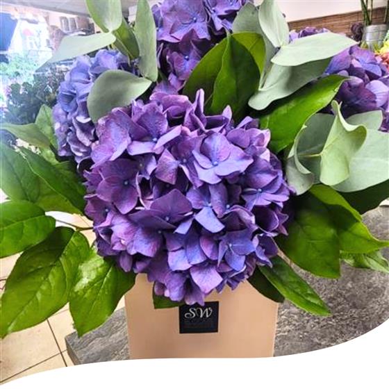 Experience the sophistication of our Purple Hydrangea Bouquet, featuring 5 exquisite Purple Hydrangeas hand-tied with fresh Eucalyptus and Salal. Arranged in a water bubble for lasting freshness and presented in a charming gift bag, this bouquet radiates elegance and charm.