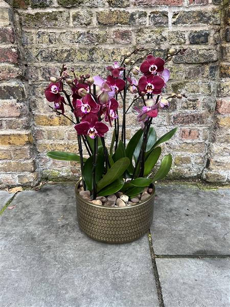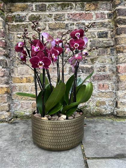 4 Purple Orchid plants in a nice gold pot with stones on the top for decoration.